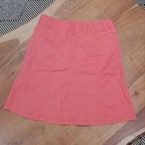 A zip and button opening skirt with a flare style and belt loops. Cotton blend.