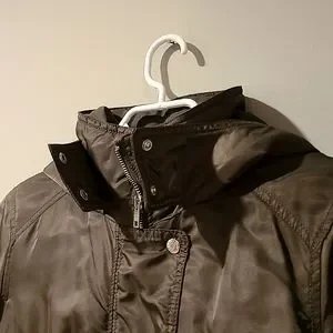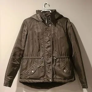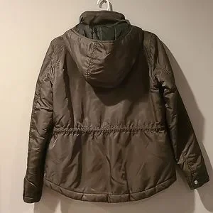This jacket has been worn a few times and is a shiny olive green in colour. The size of the jacket is a 12 in women's. There also drawstrings at the waist to adjust for sizing and a hood. The overall condition of the jacket is 8.5/10.
