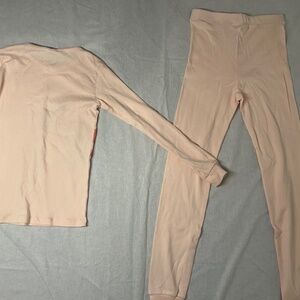"Adorable H&M two-piece pajama set in a warm peachy-beige tone featuring a bold unicorn graphic with “Magical Dreams” text on the long-sleeve top and matching solid leggings. Made from 100% cotton for a soft, breathable feel and a snug, cozy fit that’s perfect for bedtime or lounging. The whimsical unicorn print adds charm, while the elastic waistband on the pants ensures comfort all night. Ideal for year-round sleepwear or as a fun gift for unicorn lovers. Estimated original retail price based on similar H&M styles.