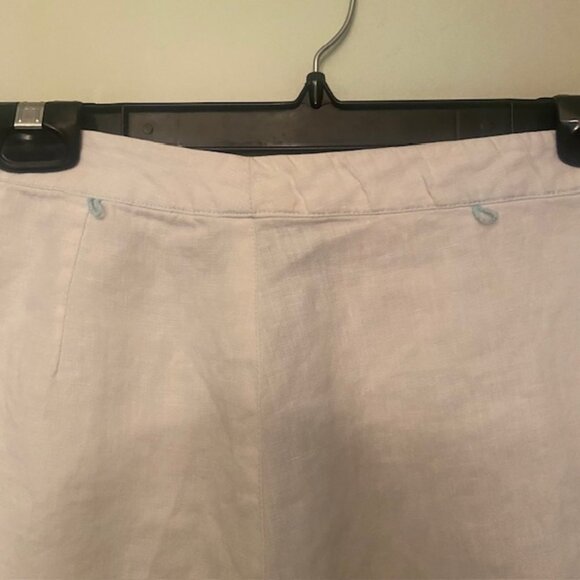 WOMEN'S LINEN SKIRT WITH SIDE CONTRAST AQUA COLOR ZIP CLOSURE, THREADED CONTRAST AQUA COLOR LOOPS, BOTTOM PORTION OF SKIRT CUT ON BIAS GIVING IT A SEMI FLARE STYLE