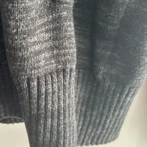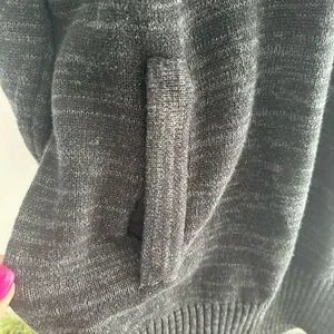 Cozy charcoal dark sweater with a stylish hood. Features button detail and front pockets.
