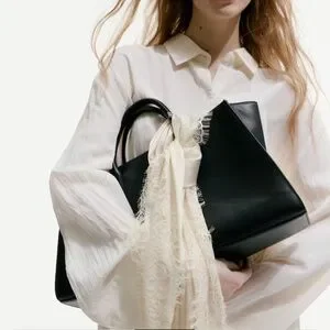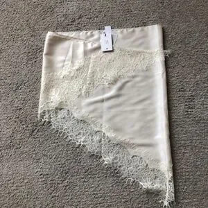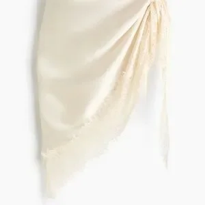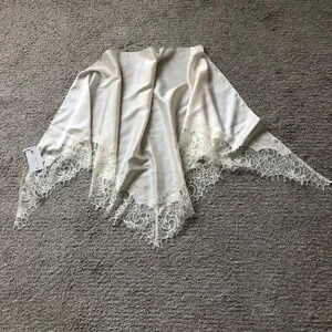 Large triangular scarfs in softly draped satin with lace trim at two sides.