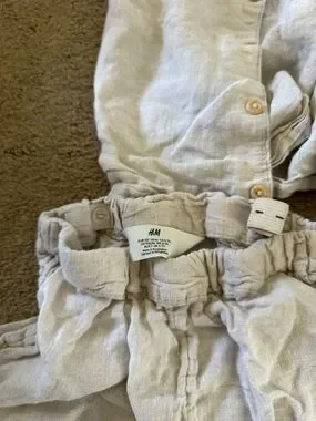 Two-piece linen set with button-up top and elastic waist shorts. Breathable, lightweight fabric. Casual, neutral design for everyday wear.