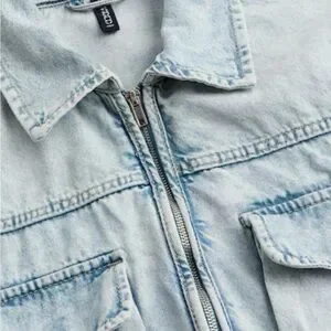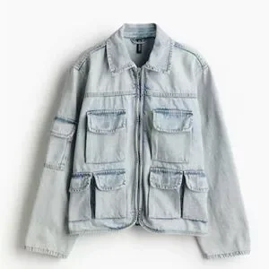 Stylish light blue jean jacket lil oversized Features multiple front pockets. Classic collar and zip closure.