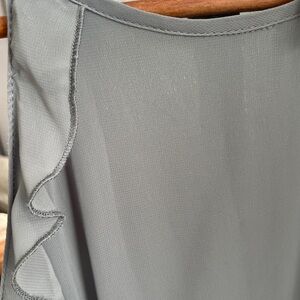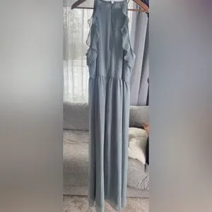 Elegant light blue dress with ruffle details. Sleeveless design. Perfect for any occasion.