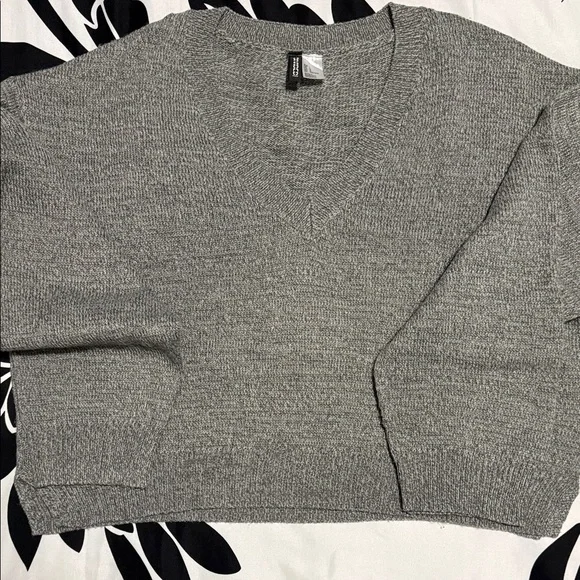 Soft ribbed knit with a V-neck silhouette. Lightweight and cozy. Neutral light gray tone for easy pairing.