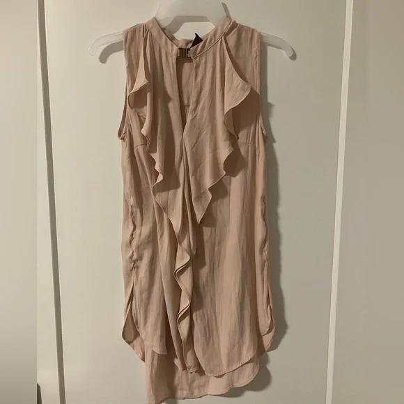 Chic sleeveless blouse with cascading ruffles. Soft pink hue for a feminine touch.