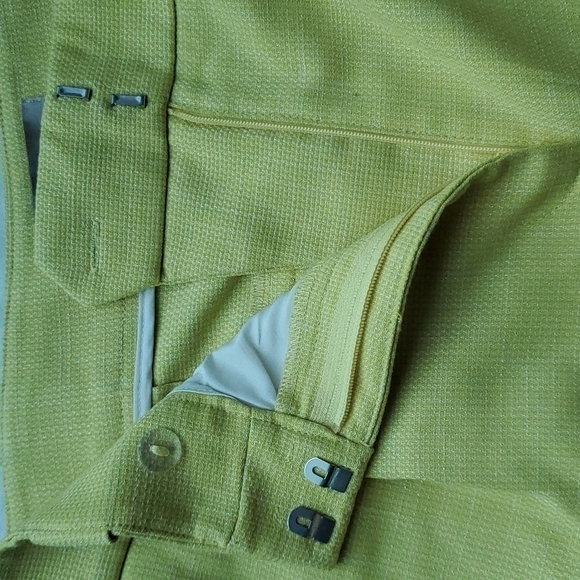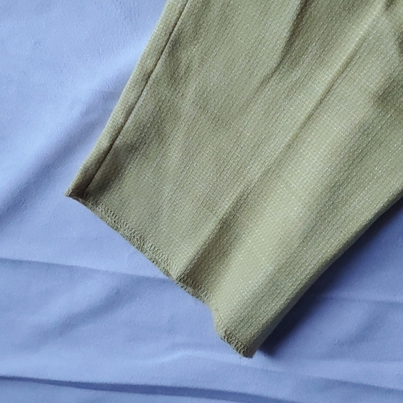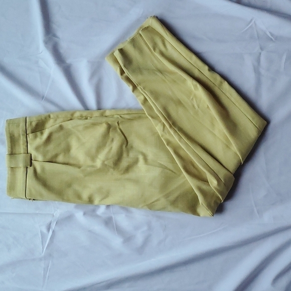 "Ankle-length slacks in woven fabric. High waist, fly with concealed zip and hook-and-eye fasteners, and pleats at top. Diagonal side pockets, mock welt back pockets, and tapered legs."