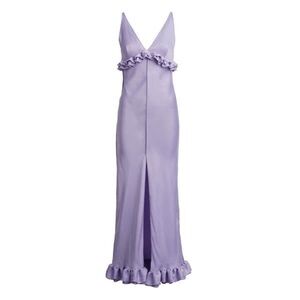 Charming lilac dress with delicate ruffles and middle slit. Features pearl and gemstone detailing. Ideal for elegant events.