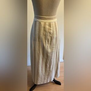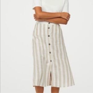Very pretty H&M Linen Blend Sand and White Striped Midi Skirt. Tortoise shell buttons down the front.