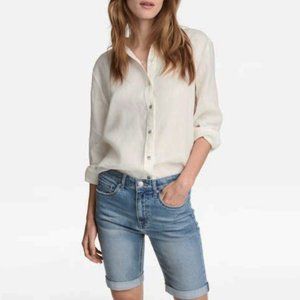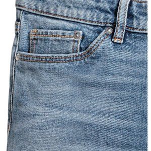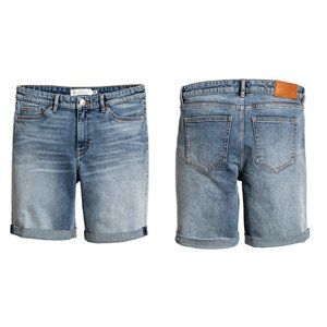 H&M Long Denim Bermuda Jean Shorts in washed stretch denim with slightly longer legs and sewn-in cuffs at the hems.