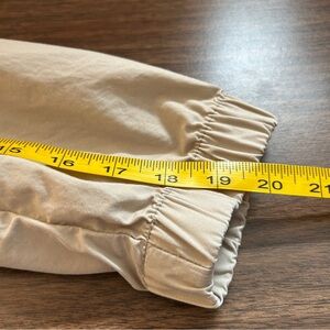 Light tan raincoat with hood. Includes front pockets and drawstring. Ideal for rainy days.