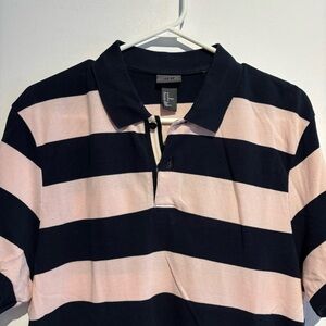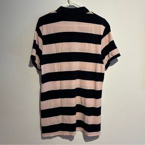 H&M men’s polo shirt in pink and navy blue horizontal stripes. Short sleeve, two-button placket, classic rugby-inspired style. Size Medium.