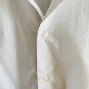 A wardrobe staple -- a clean, white, slim fit button down shirt.