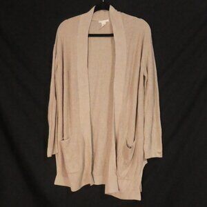 Cozy and casual, this long beige knit cardigan features an open front and two front pockets