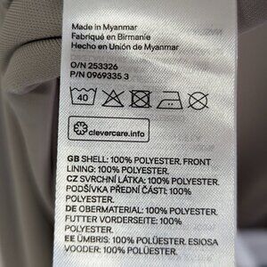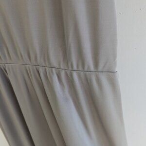 This is an H&M V-neck light grey midi dress with a gathered elasticized seam at the waist. Straps not adjustable, double v neckline, for front and back. 100% polyester.