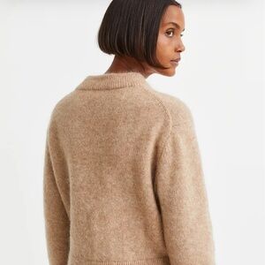 This H&M mohair-blend sweater is a cozy yet refined essential, perfect for both casual wear and elevated layering. Designed with a slightly boxy fit, ribbed mock neck, and soft ribbed trims, it delivers warmth and comfort without sacrificing style. The natural, neutral tone makes it endlessly versatile—pair it with jeans for an easy off-duty look or with tailored trousers and skirts for a polished outfit. A timeless piece that transitions effortlessly from season to season. In excellent condition!
