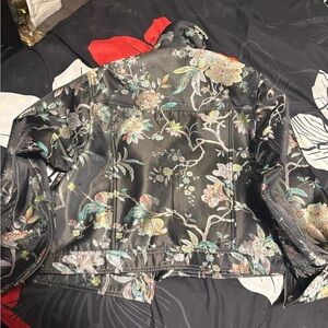 Stylish bomber with floral design. Features a dark base. Perfect for layering.