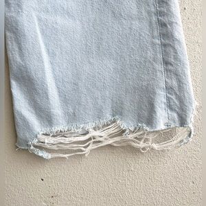 - Denim has a rough finish and is lightly distressed-- the pant hems also have a uneven raw edge. No stretch.