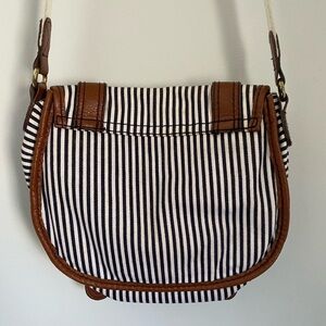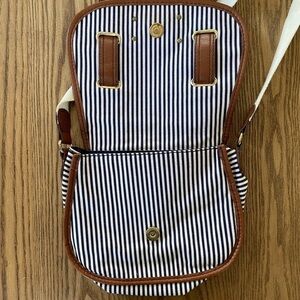 Navy and white striped small shoulder bag with faux leather detailing. Purse has a small pocket and zipper pocket inside. Magnetic clasp to close the front flap. Small imperfections shown in photos. Great condition otherwise.