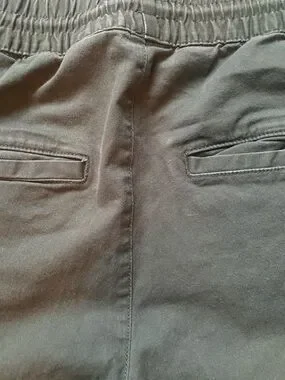 H&M men's joggers in olive green. Elastic drawstring waist for adjustable fit. Ruched detailing along lower legs. Side pockets for storage. Zip hem at ankles.