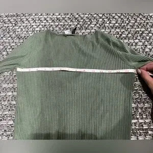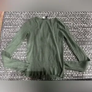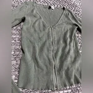 Chic olive ribbed long sleeve with zip closure. Ribbed, v-neck