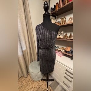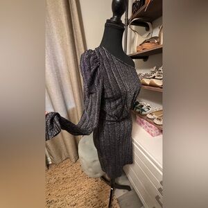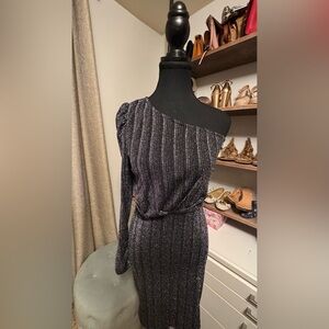 This elegant one-shoulder black dress is perfect for any special occasion. The shimmering fabric adds a touch of glamour, making it a standout piece in your wardrobe.