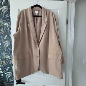 Single breasted lined tan oversized blazer from H&M. Great layering piece that can double as light outerwear for fall/spring. Looks great with sleeves rolled up or all the way down. Fit is very generous throughout the body, very little stretch.