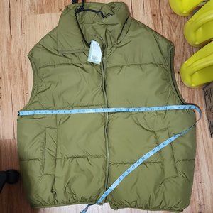 Padded, oversized vest in quilted woven fabric. Stand-up collar, zipper at front with anti-chafe chin guard, and diagonal welt front pockets. Elasticized trim at armholes and hem. Lined.