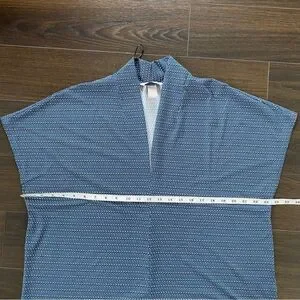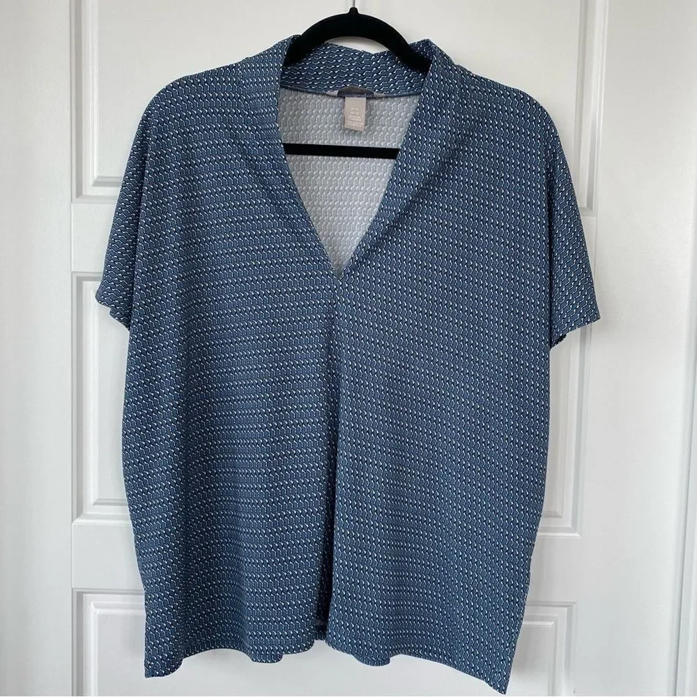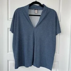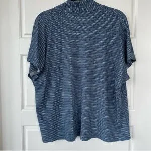 Slit v neck Cap sleeve Lots of stretch to it Fun pattern Measurements pictured