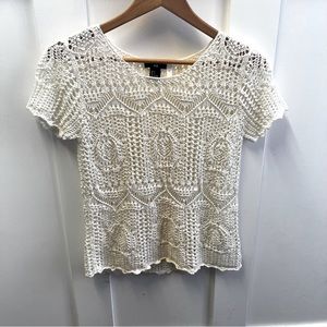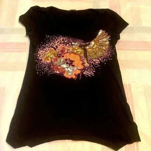 This is a very cute black t-shirt from H & M with allover sparkly sequin pineapples. This is in very nice used condition with no flaws noted. Size Small pit to pit measurement 17" and length from underarm to bottom hem 15".
