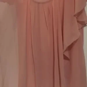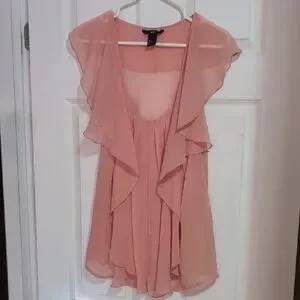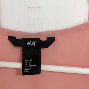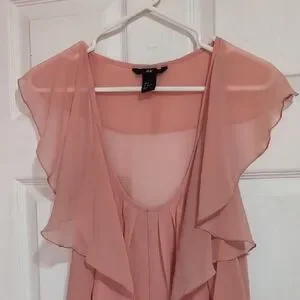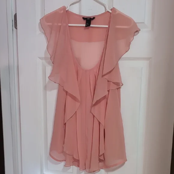 This charming pink blouse from H&M showcases flutter sleeves and an ruffled design, offering a romantic and stylish look. The sleeveless top is crafted for a light and airy feel, making it perfect for perfect for work business casual attire or night out.