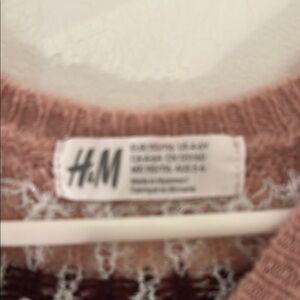 This H&M sweater features a soft pink base with a classic crew neck design, highlighted by a striking Nordic-style pattern in white. The long sleeves and fuzzy knit texture make it a cozy choice for cooler days.