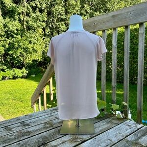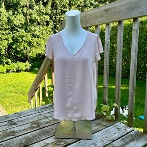 H&M pink blouse, size 6. V-neck, flutter sleeves. Sheer fabric, but double-layered front. Non stretch fabric; 100% polyester.