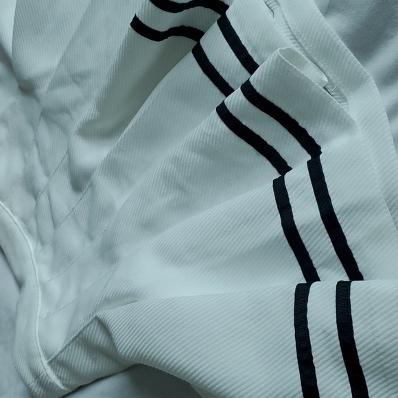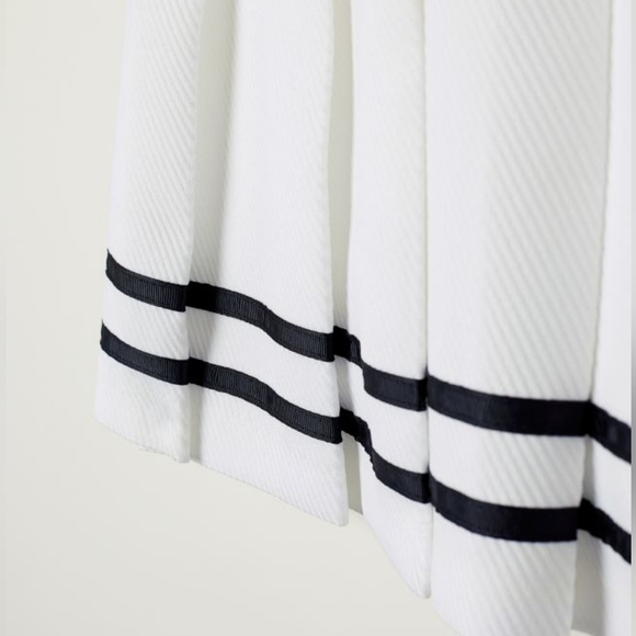 "Short, pleated skirt in textured-weave fabric with a concealed side zip. Grosgrain trim at hem. Unlined."