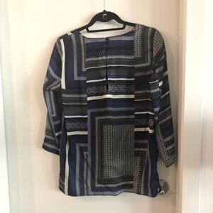 Straight-cut multi-colour top blouse. Round neckline, opening at back of neck keyhole with button, and 3/4-length sleeves.