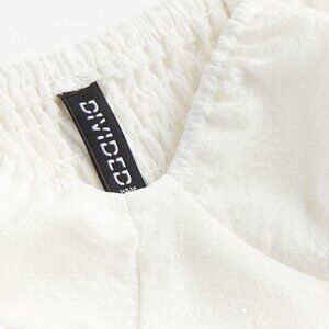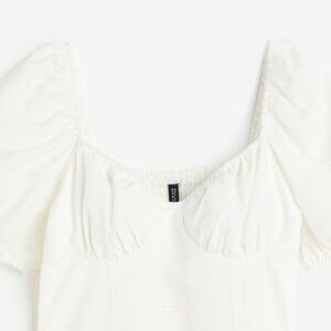 โข Short dress in woven, crรชped fabric. Sweetheart neckline, shaped cups, concealed zipper at one side, and a smocked section at back. Short puff sleeves and narrow elastic at front of neckline, over shoulders, and at cuffs. Gently flared skirt.