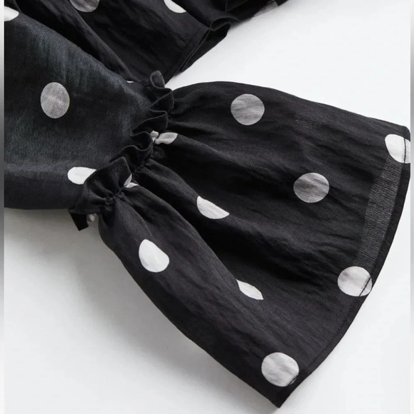 H&M Puff-sleeved Peplum cropped Blouse | Black and Silver Polka Dots | Size XS