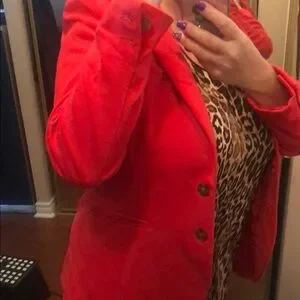 Stylish red blazer with button closure. Perfect for formal or casual wear.