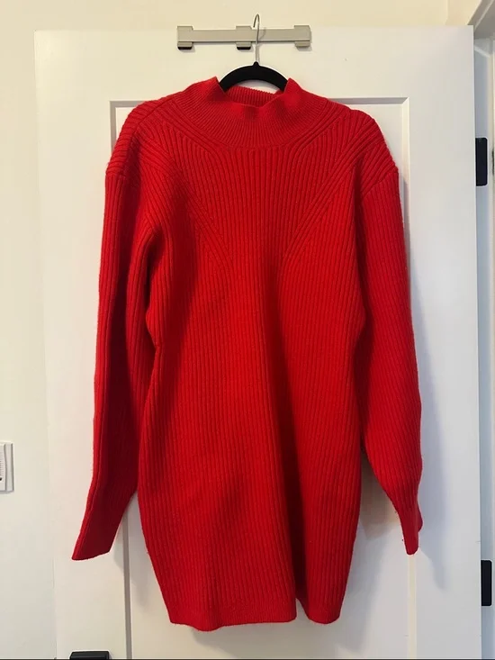 Vibrant red ribbed knit sweater from H&M. Features a cozy turtleneck and long sleeves. Relaxed, slightly oversized silhouette. Simple, versatile piece for layering.
