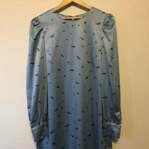 Very good preowned condition, pale blue, silky midi dress featuring black cranes or herons with 70s retro vibes by H&M. Cute and unique this dress has a button closure at the neck, a keyhole opening at the back, ruched 70s statement sleeves and tons of buttons along the arms and a matching belt for adjustment.