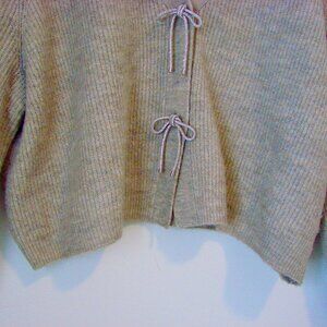 H&M Rhinestone Bow Cardigan Sweater Beige Taupe Wool Blend V-neck Ribbed Oversized ~ Size XL on tag but could probably fit a size 1X (see measurements)