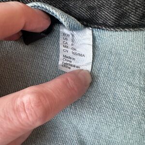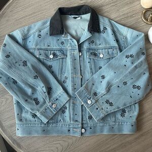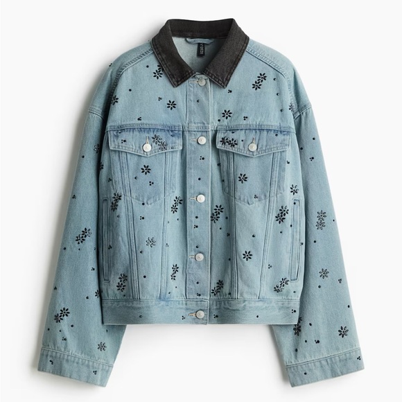Trucker-style jacket in a cotton denim embellished with black sparkling rhinestones. Contrasting collar, metal buttons at front, and a yoke at front and back.