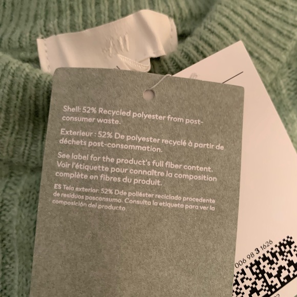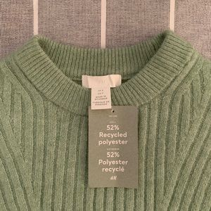 Boxy-fit rib knit sweater from H&M, never worn with tags still attached. It’s a soft green colour, a little bit more vibrant then a sage green or a pastel green. Would be a perfect piece for this upcoming spring season or really any time in the winter or fall. Made of polyester, acrylic, wool and elastane, the material has a nice drape and soft brushed feel. The sweater is a size small but since it’s boxy and oversized, it could definitely fit other sizes depending on the fit / style you are looking to achieve. I can provide measurements at your request!