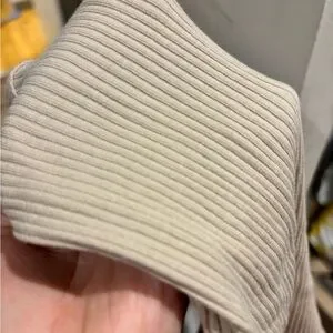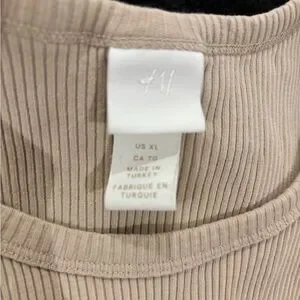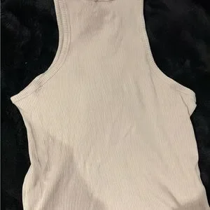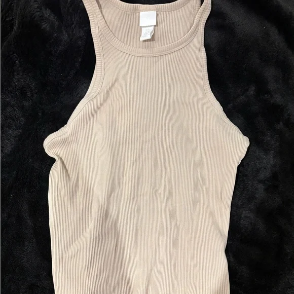 Sleeveless ribbed tank with a high neckline. Lightweight stretch fabric for comfortable wear. Neutral beige shade pairs easily with many outfits.
