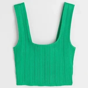 Fitted ribbed crop tank with a square neckline. Wide straps provide secure support. Soft stretch knit that hugs the body. Simple, versatile piece for layering or wearing alone.