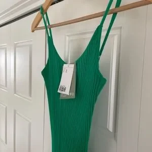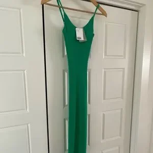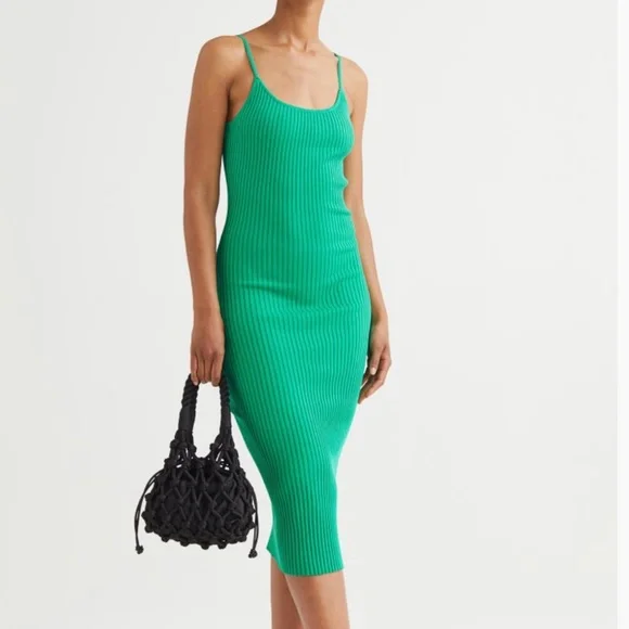 Fitted, sleeveless, calf-length dress in a rib-knit viscose blend. Narrow, adjustable shoulder straps.