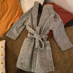 Very well made. Soft, thick fabric. Pockets on either side. Sleeves are not too long. Smoke free/ pet free home.