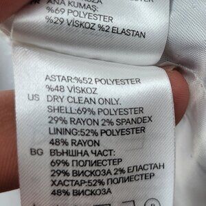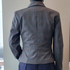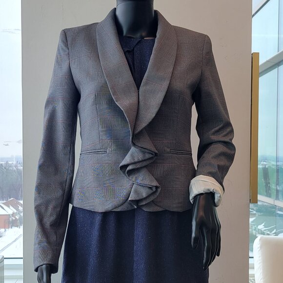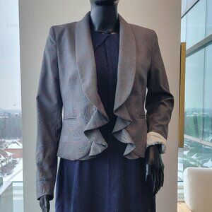 Enjoy a blazer that still keeps that sophisticated and professional aesthetic while still looking cute. The ruffles at the front of the blazer adds a unique design. The blazer is buttoned through three hooks that are so small that they can't be seen when hooked which means its more attention for the ruffles. There is padding in the shoulders for a broad ish look, along with small pockets at the front of the blazer. As you move to the lower end of the blazer, you will see that it hugs the body giving a more form fitting look. The blazer is suitable for formal or semi-formal occasions. Worn once. Very good condition!