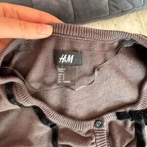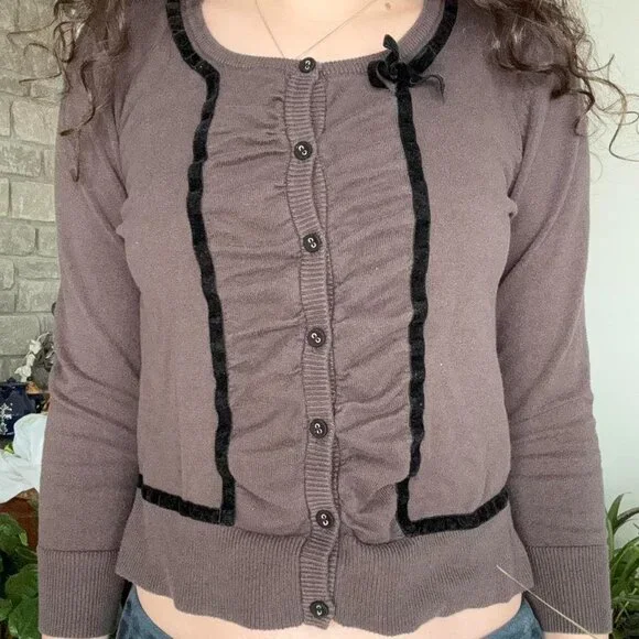preppy H&M ruffle button up brown / taupe cardigan with black velvet lining and small bow